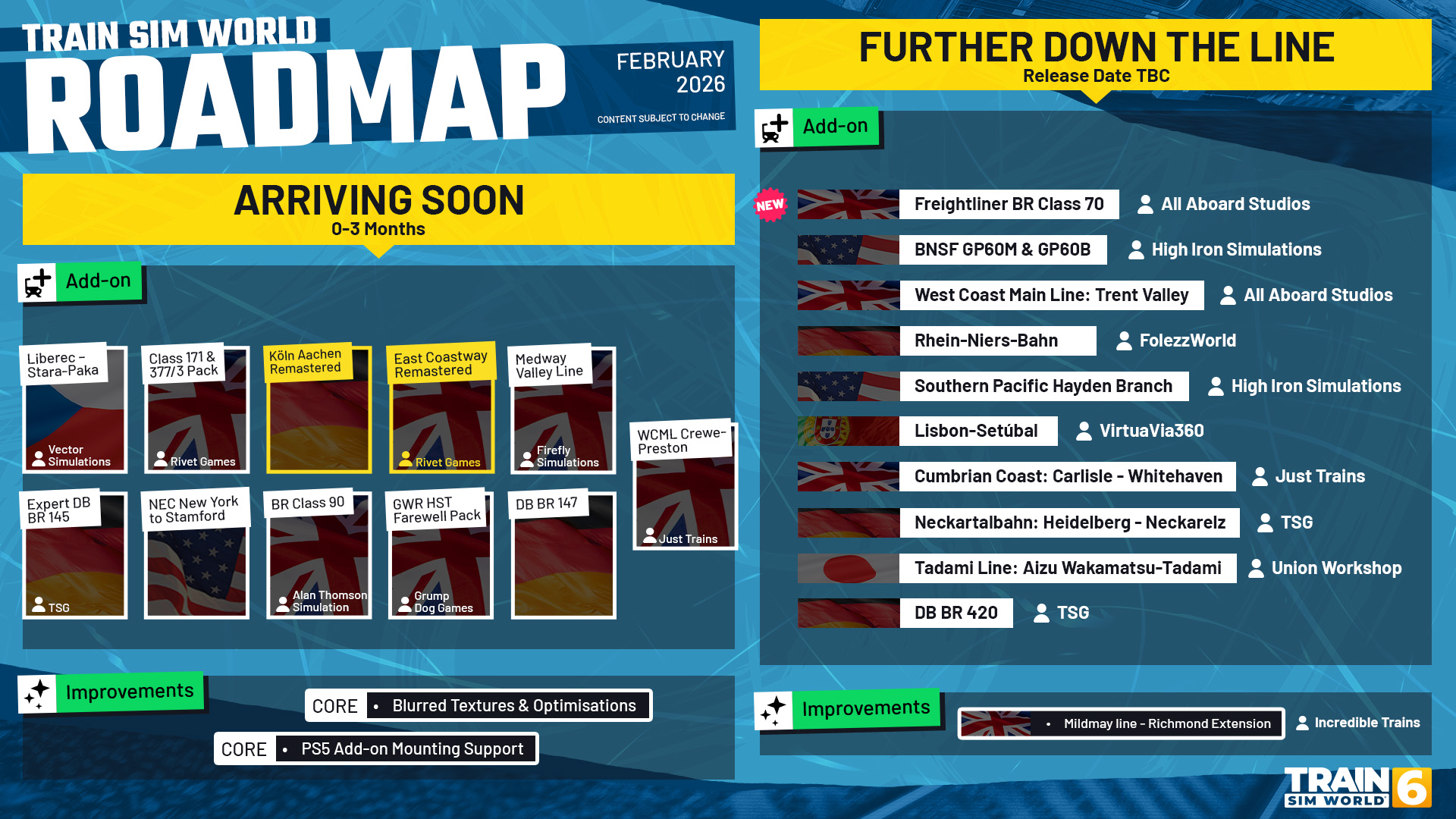 TSW February 2026 Roadmap Festival of Rail 2026 – Discover amazing deals on TSW Add-ons and more in our biggest publisher event! Content Up Ahead – Progress updates on new developments our teams are working on! Great Western Express Remastered - Out Now!, Schnellfahrstrecke Köln-Aachen Remastered - Arriving Thursday!, East Coastway Remastered - Coming Soon!, NEC New York to Stamford - First look at the M8!, Progress update on the DB BR 147, Partner Programme Updates – Hear additional news and reveals from across our partner programme! Announcing the Freightliner Class 70 from All Aboard Studios!, HST Farewell Tour from Grumpdog Games - Coming Soon!, Southern BR Class 171 & BR Class 377/3 from Rivet Games, WCML: Crewe – Milton Keynes via Trent Valley from All Aboard Studios, West Coast Main Line: Crewe - Preston from Just Trains, Expert DB BR 145 from TSG, BNSF Electro-Motive GP60M from High Iron Simulations, Southern Pacific Ore Lines from High Iron Simulations, The Tadami Line by Union Workshop, Liberec - Stará Paka from Vector Simulations, Medway Valley Line from Firefly Simulations, Community Corner – Let's take a look at all the community-news happening this month! Festival of Rail 2026 - Ending soon!, February Monthly Mastery – Live Now, Introducing Thomas & Friends™: Wonders of Sodor, Train Simulator Classic - New Add-ons Coming Soon, Metro Rivals: New York - First Dev Blog tomorrow -